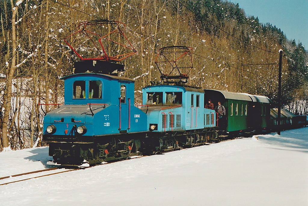 E2 und E3 fahren mit ihrem GmP (Güterzug mit Personenbeförderung) am 9.2.2005 durch das Breitenauertal nach Mixnitz.