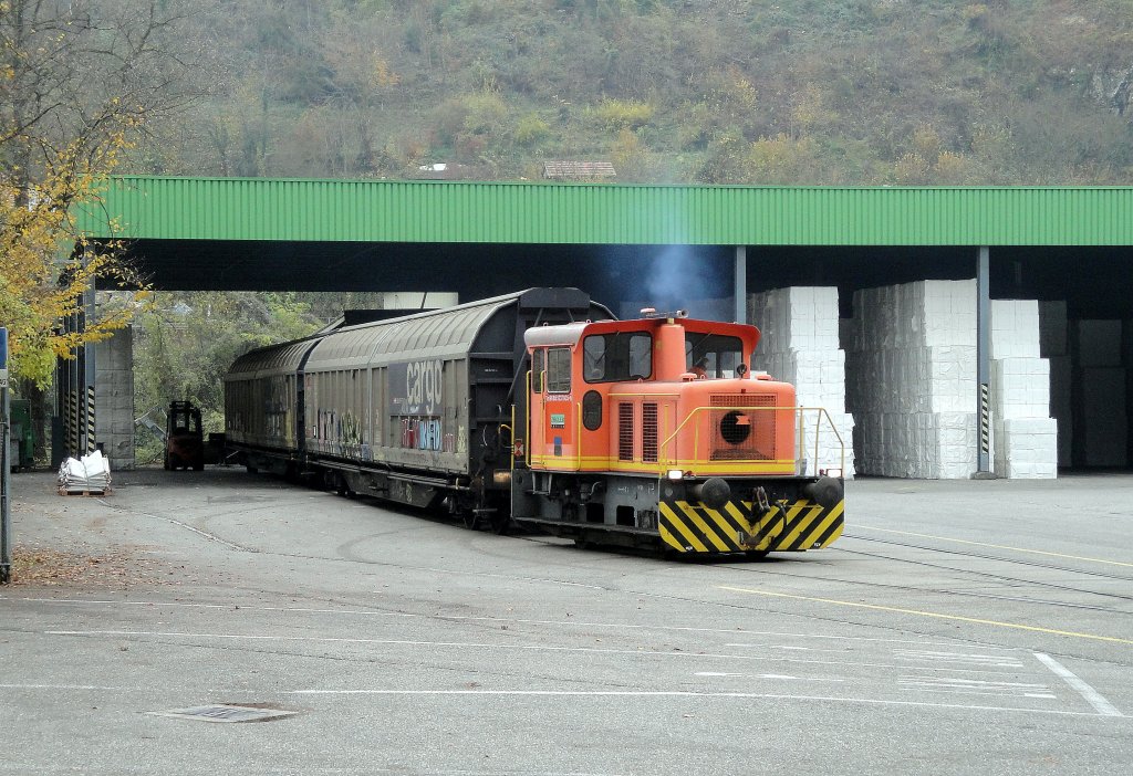 Der Tm 98 85 5237 935-6 stellt am 13.11.12 in Grellingen zwei Habbiillnss der SBB Cargo zu. Um zu diesem gedeckten Verladeplatz zu gelangen, mussten zwischen den drei Fahrzeugen Spezialkupplungen in Form von Stangen angebracht werden, damit die Wagen die engen Kurvenradien überwinden können.