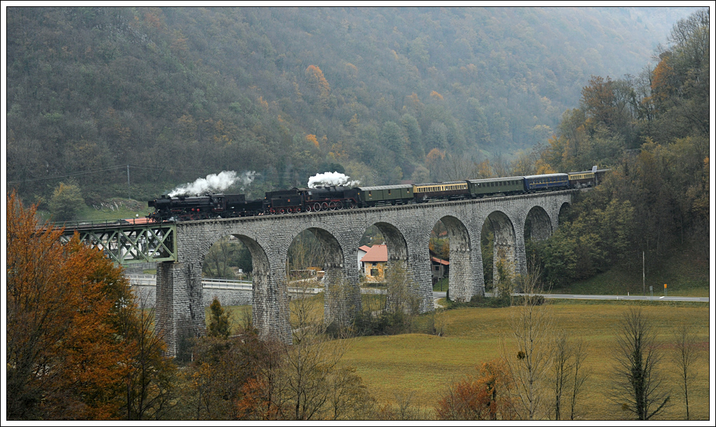 33-037 als Vorspann vor 06-018 am 10.11.2012 mit ihrem Sonderzug 13403 von Jesenice nach Nova Gorica, aufgenommen kurz vor dem Bahnhof Most na Soči auf der Wocheinerbahn.