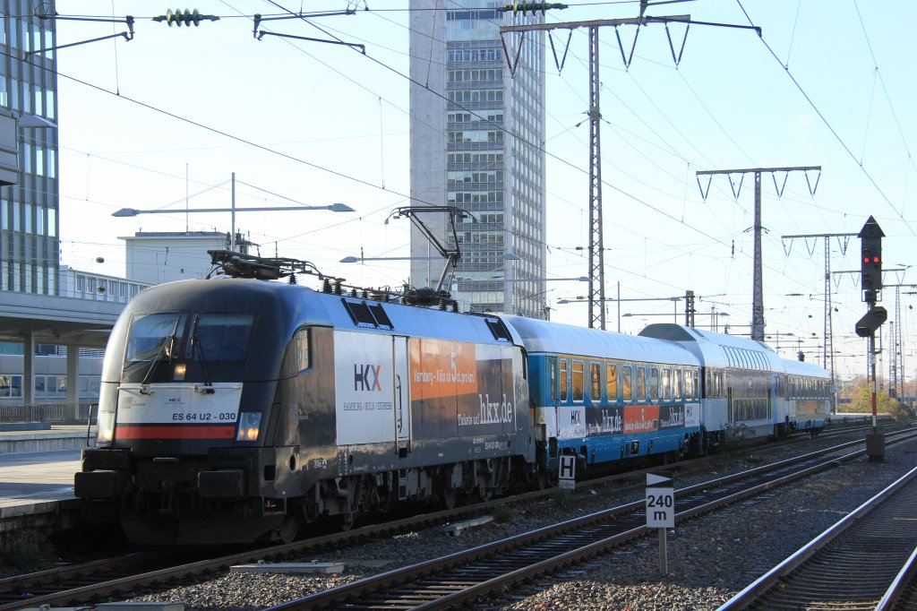 MRCE 182 530/ES 64 U2-030 mit HKX 1803 mit drei Waggons mit dem Doppelstockwagen von Railpool in der Mitte des Zuges am 20.11.2012 in Essen Hbf.