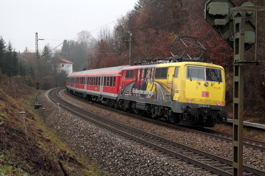 111 024 schiebt den RE von Salzburg nach München, aufgenommen am 23.11.2012 bei Bergen.