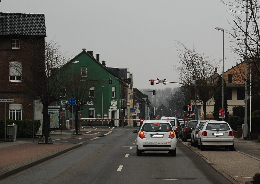 Bahnübergang Talstraße in Kapellen/Erft mit geschlossener Schrankenanlage, warten bis die RB 38 passiert.2.3.2012