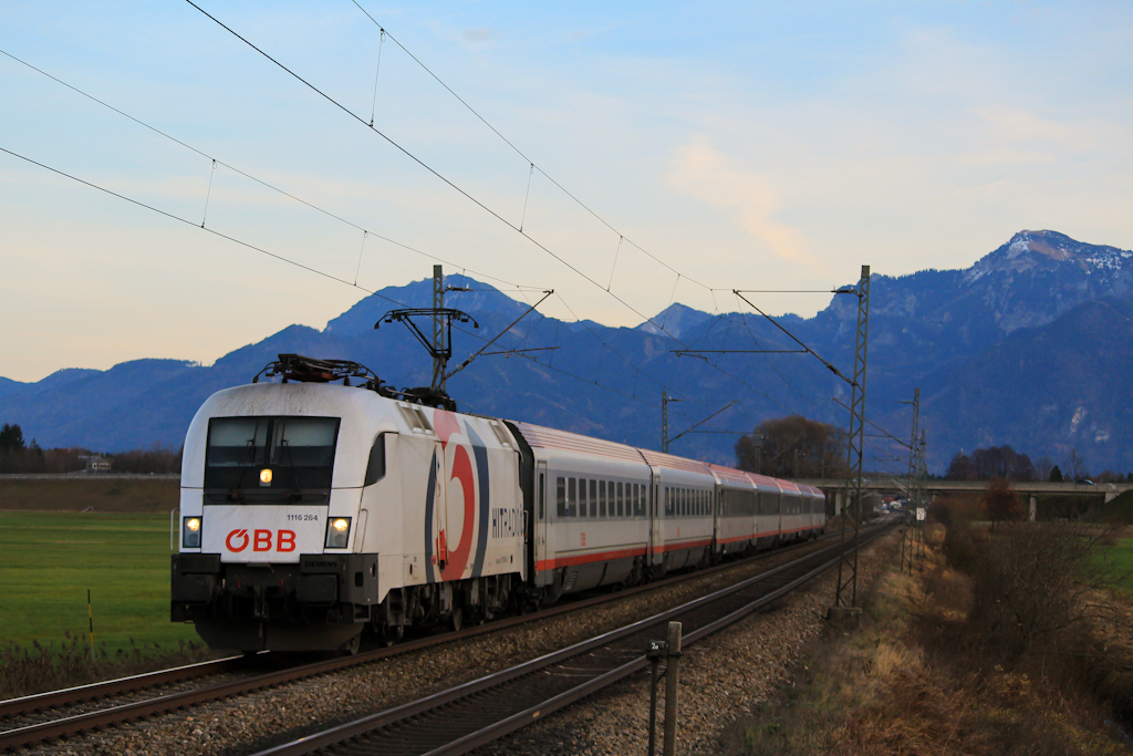 1116 264 "Ö3" mit einem EC nach München HBF. Aufgenommen am 24. November 2012 bei Übersee (Chiemsee)