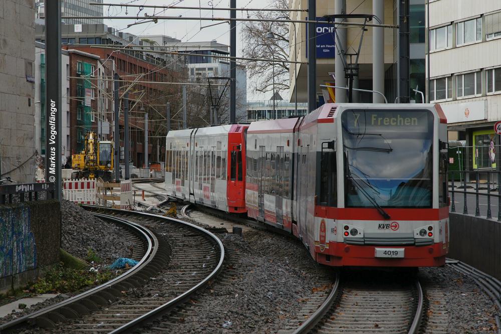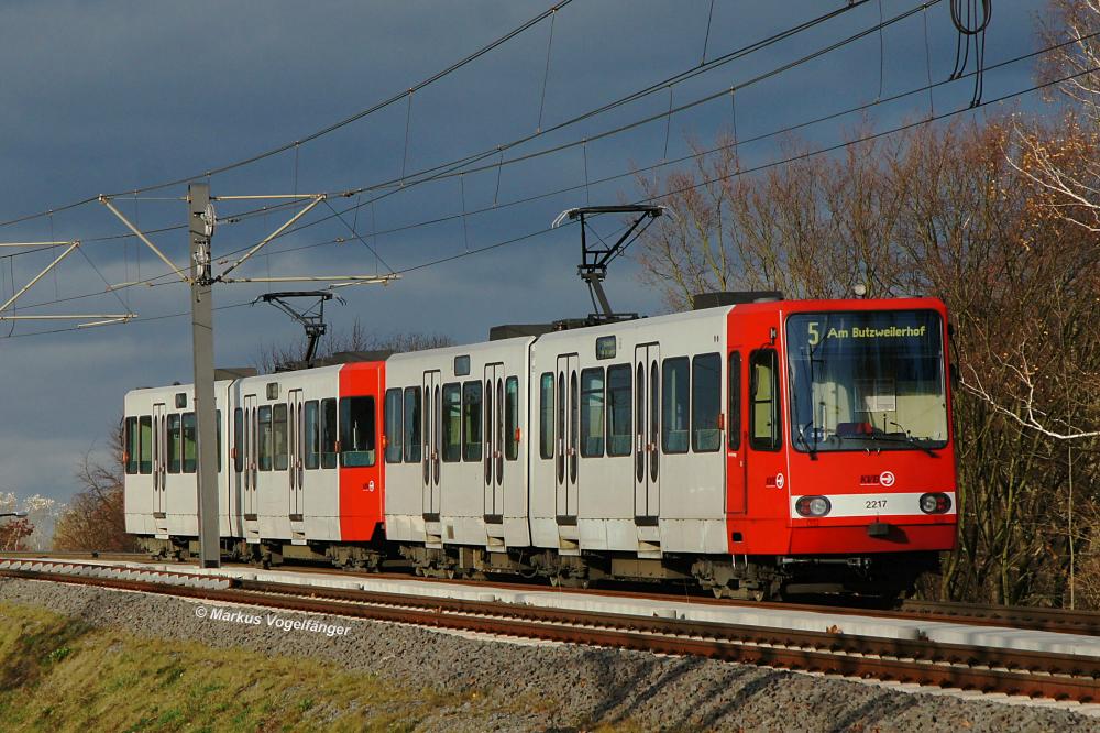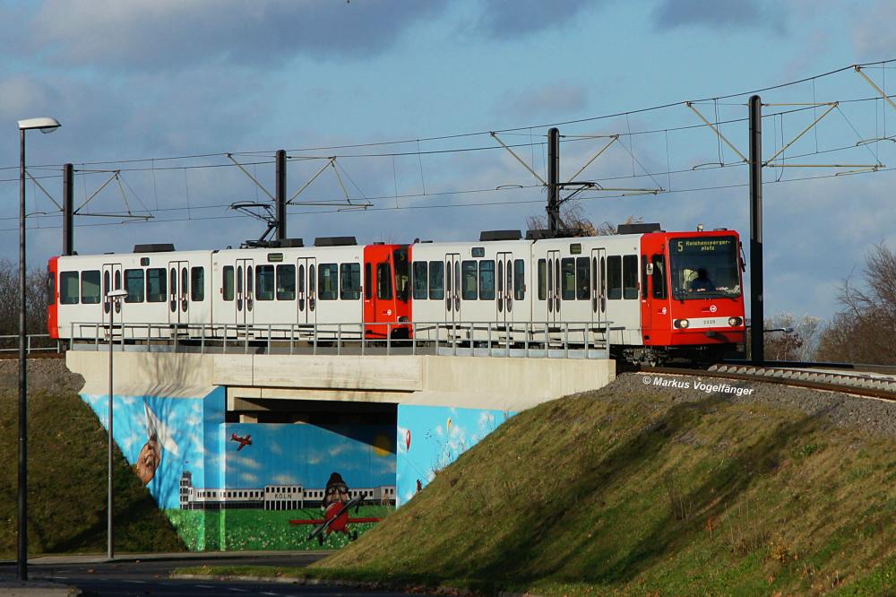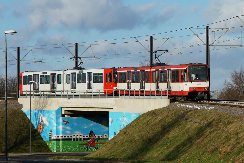 Die B-Wagen 2119 (führend) und 2110 auf der Brücke in Ossendorf am 25.11.2012.