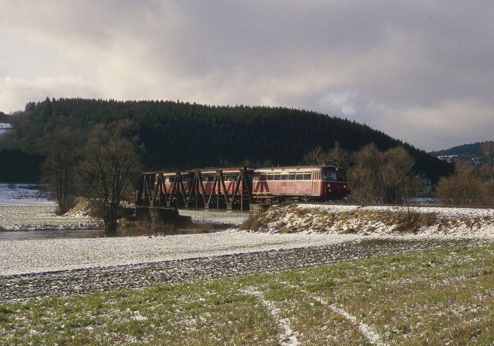Bei Battenfeld überqueren 798 823-1 + 998 184-6 + 998 859-3 am 05.12.1992 die Eder auf dem Weg nach Hatzfeld.