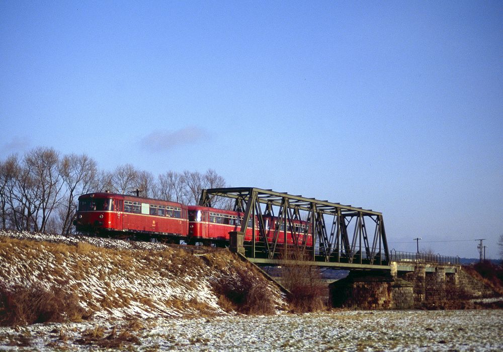 798 823-1 + 998 184-6 + 998 859-3 überqueren die Eder bei Holzhausen im Rahmen der Sonderfahrt "Abschied von der Edertalbahn" am 05.12.1992