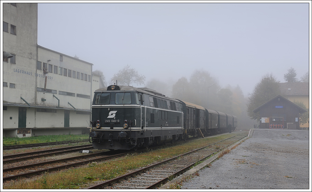 2143 040 mit dem Reblaus Express 16973 (Drosendorf-Retz) abfahrbereit in Drosendorf am 20.10.2012.