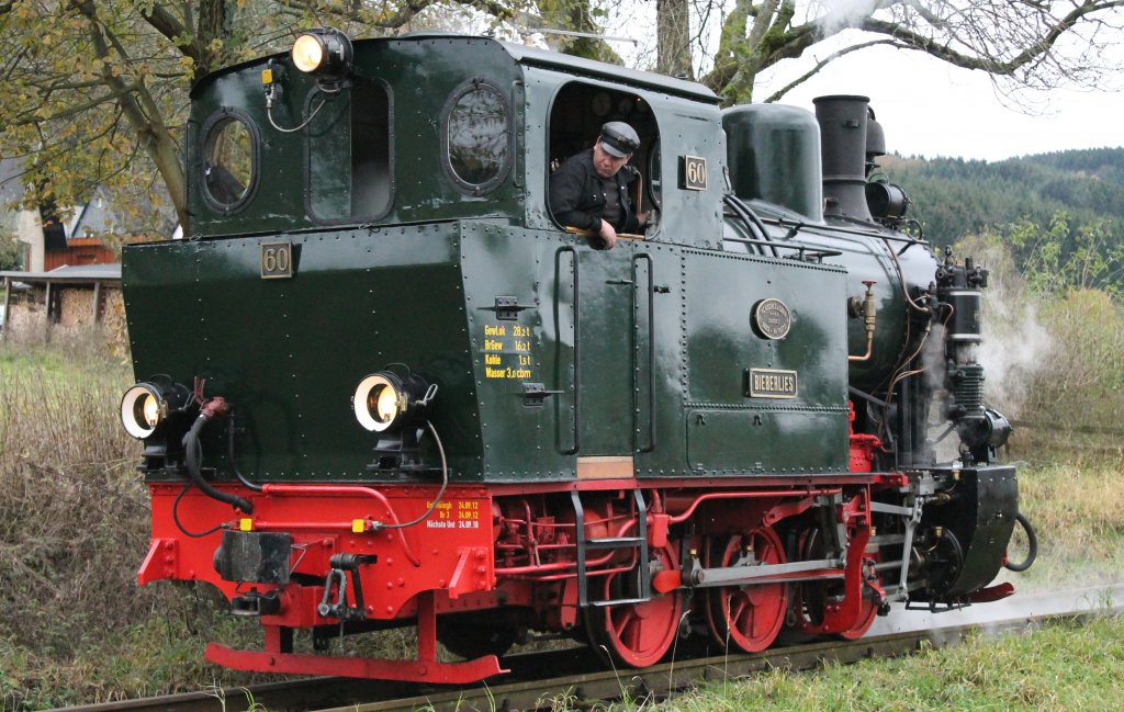 Dampflok 60  BIEBERLIES  (Betr.Nr.60, Cn2t, Henschel & Sohn, Bj.1923) der Sauerländer Kleinbahn beim Umsetzen am Hp Seissenschmidt  um 14;00 am 04.11.2012. Sonderfahrtag unter dem Motto  Dampf-Kohl-Fahrten .