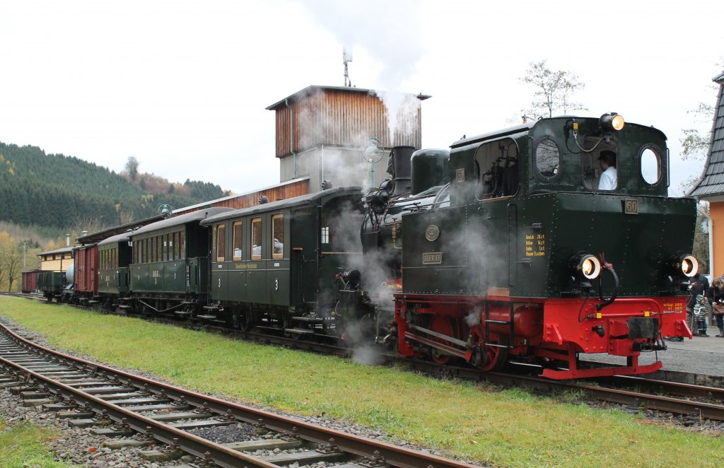 Dampflok 60  BIEBERLIES  der Sauerländer Kleinbahn mit Sonderzug vor dem Bahnhof Hüinghausen um 12;15. Sonderfahrtag des Museumszugs am 04.11.2012 unter dem Motto  Dampf-Kohl-Fahrten .