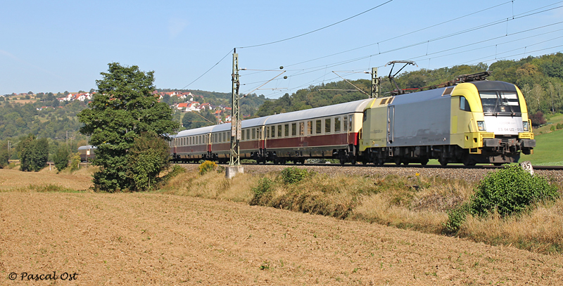 In Ermangelung einer Lok der BR 103 kam am 9. September 2012 die gelb-silberne 182 513-2 vor einem TEE-Sonderzug zum Einsatz. Bei Uhingen auf der Filsbahn konnte auch ich diesen Einsatz dokumentieren.