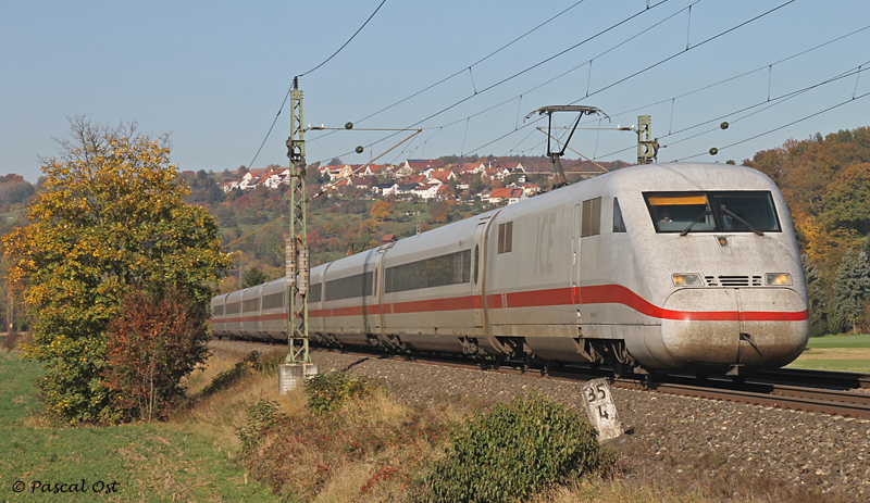 Und nochmal der ICE 593 auf der KBS 750 bei Uhingen. Dieses Mal aber mit Herbstfärbung und einem deutlich verdreckteren Zug. Aufgenommen am 21. Oktober 2012.
