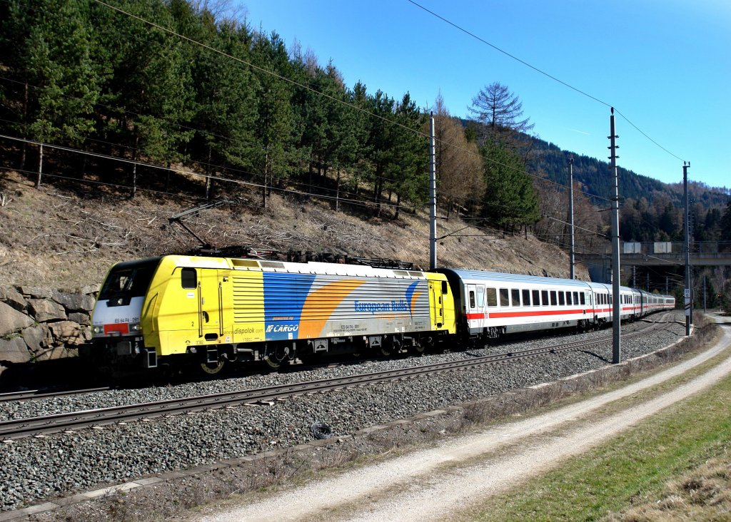 189 991 mit EC 80 von Bozen nach München Hbf am 07.04.2010 unterwegs bei Matrei am Brenner.