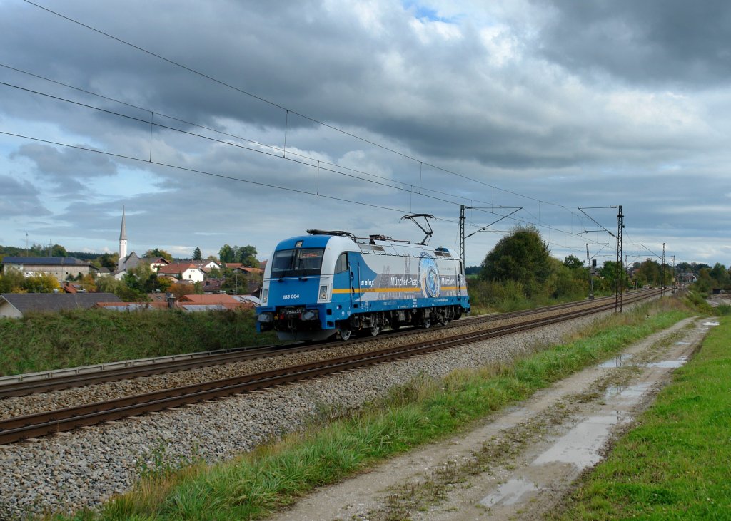 183 004 "München-Prag-Ticket" bei einer Überführungsfahrt von Linz nach Regensburg am 13.10.2012 unterwegs bei Ostermünchen.