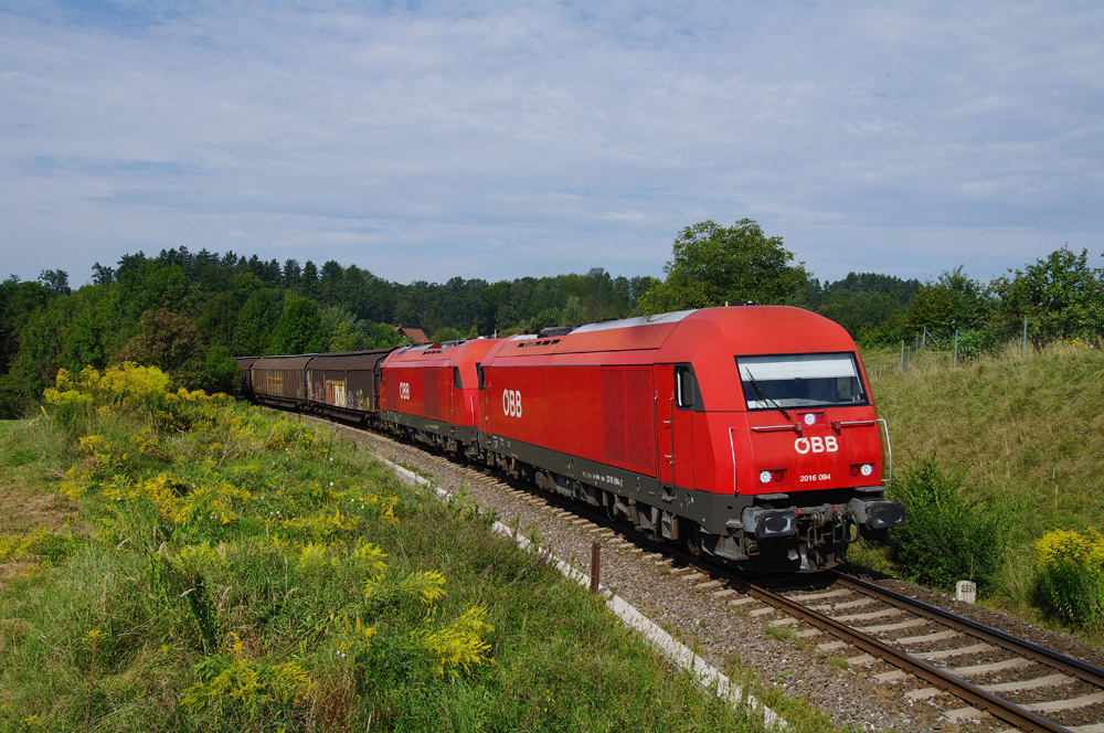 2016 094 und 2016 080 waren am 21.08. mit eim Güterzug in Richtung Fehring unterwegs, aufgenommen entlang der "Ostbahn-Westrampe" bei Kilometer 239,5 in Hart bei Graz.