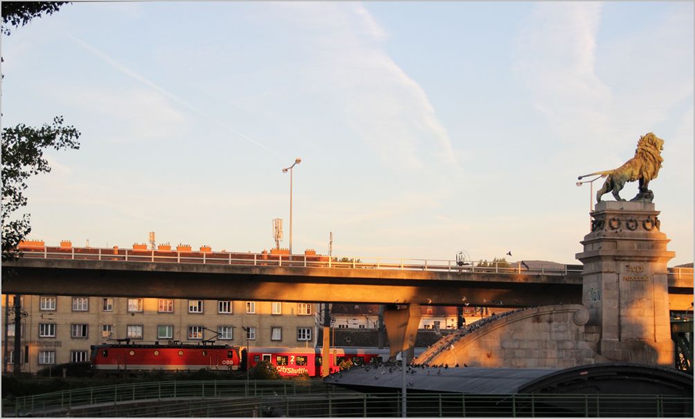 Beim Nußdorfer Löwen vorbei fährt Regional - Express 2167 in den ersten Sonnenlichtern Richtung Wien FJB. Wien/Nußdorf, September 2012