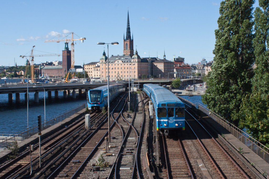Die Realität sieht natürlich etwas anders aus. Zumindest in der Hauptverkehrszeit werden einige Kurse der Stockholmer Tunnelbana noch mit Fahrzeugen der älteren Generation gefahren. Hier ein solcher Zug der Roten Linie auf der Brücke zwischen den Haltestellen Gamla Stan und Slussen.