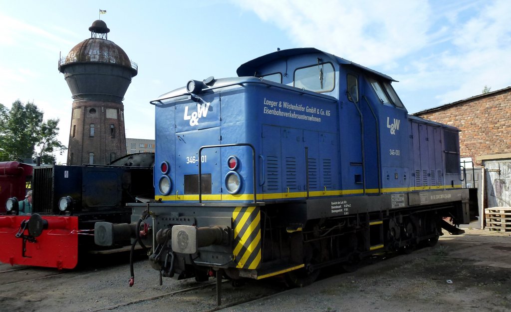 Diesellok 346 001 in Gera. Im Hintergrund der Wasserturm und eine Kö. Foto 29.09.2012