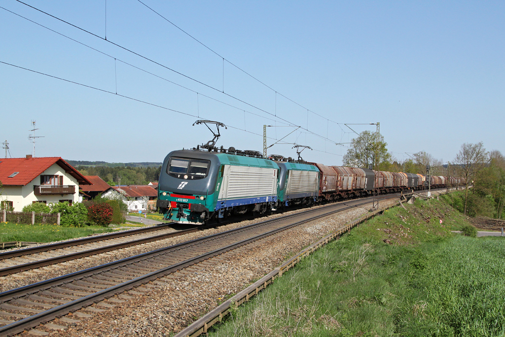 E412 017 + 013 mit einem Stahlzug am 01.05.2012 bei Ostermünchen.