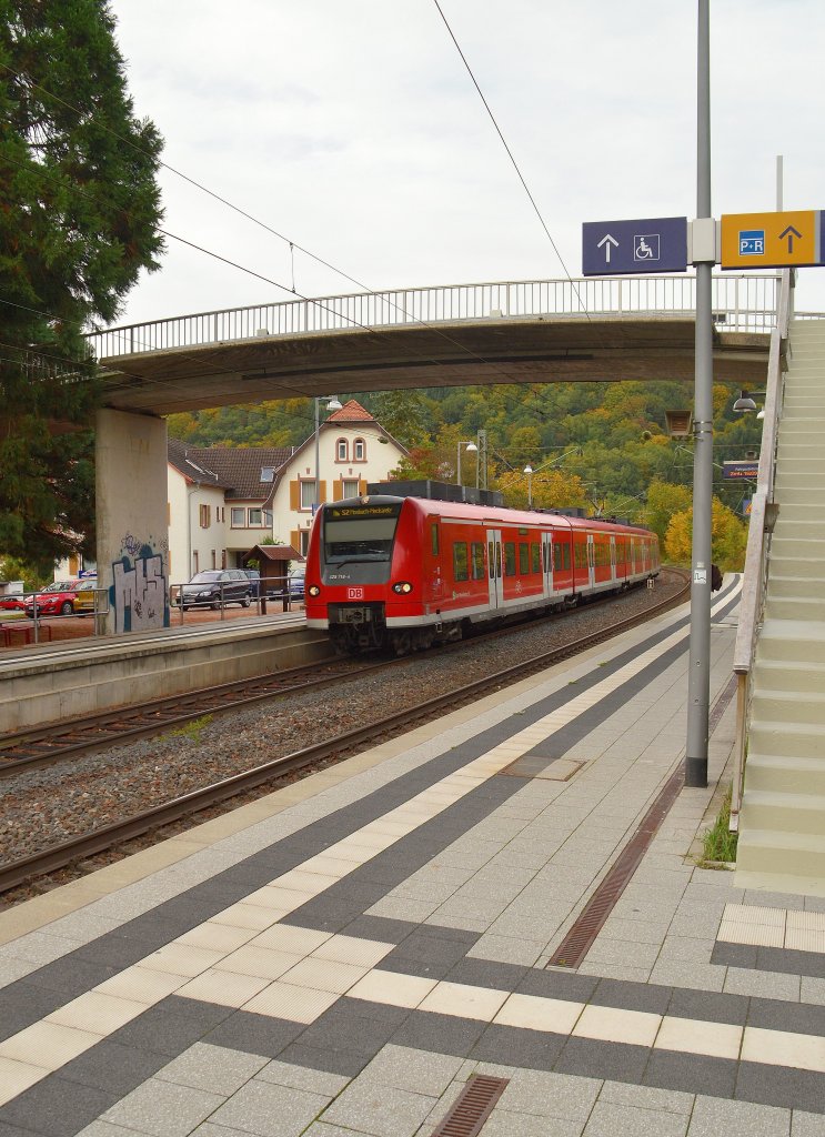 Ein S2 Zug nach Mosbach/Neckarelz am Abend des 13.10.2012 in Neckargerach. Es ist der 425 718-4 der hier unter der Fußgängerbrücke zu sehen ist.