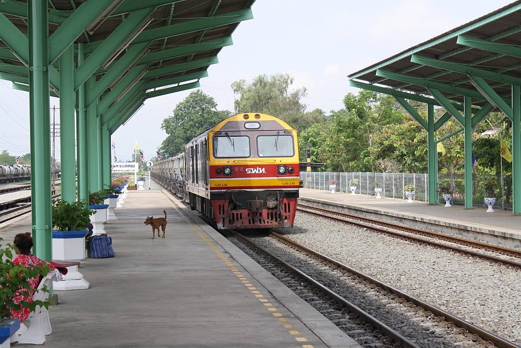 HID 4516 (Co'Co', de, Hitachi, Bj.1993) wartet am 17.Mai 2012 mit einem Schotterzug im Bf. Kaeng Khoi auf die Weiterfahrt.