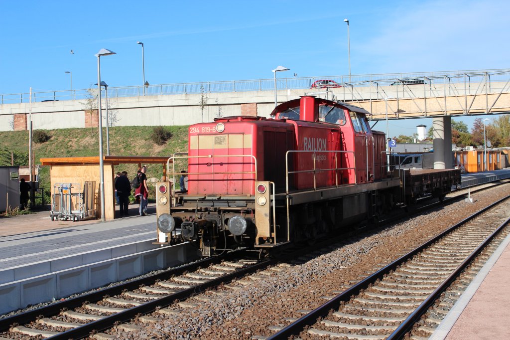 BR 294 mit Flachwagen in Bad Kreuznach auf dem Weg nach Bad Münster am Stein. Der Flachwagen dient später als Schutzwagen für den Trafo-Schwertransport aus dem Anschluss RWE in Bad Münster. Aufgenommen am 18.12.2012