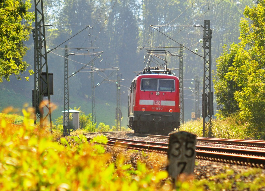 E Lok 111 006-3 schiebt an einem Spätsommertag die Regionalbahn von Salzburg nach München, bei Übersee am 17.09.2011