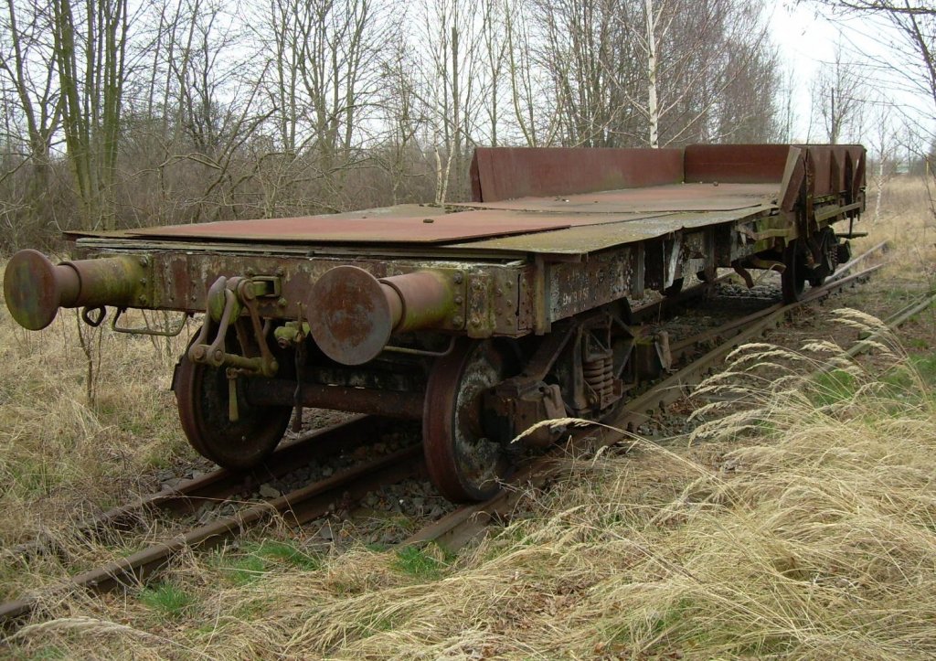 Feb. 2008, Brüssow, Prenzlauer Kreisbahn. Alter Güterwagen, made in USA.