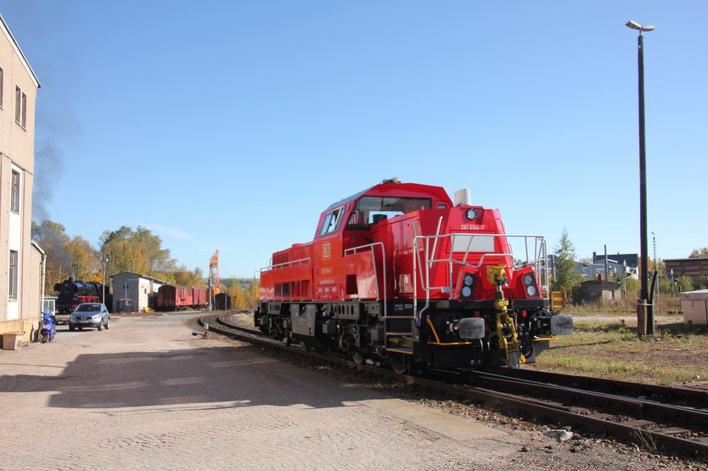 Gravita 261 094 wartet auf dem Gelände der IG 58 3047 auf neue Aufgaben.Im Hintergrund dampft 35 1097.Glauchau 19.10.2012.