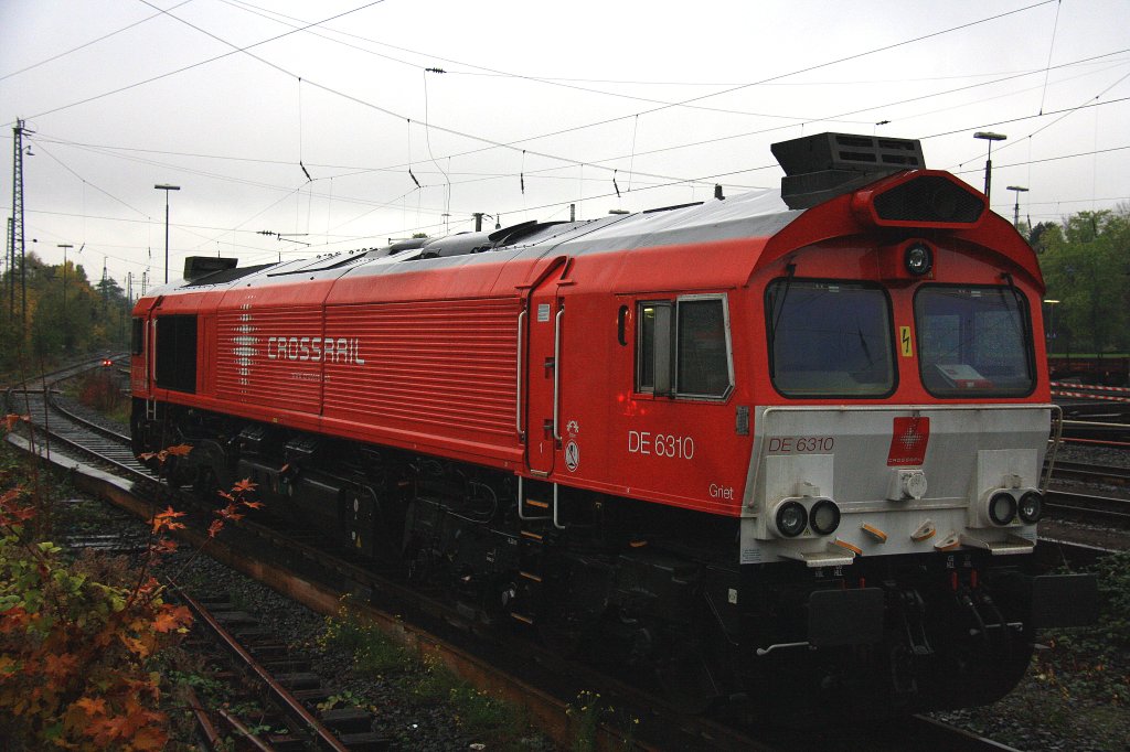 Die Class 66 DE6310 "Griet" von Crossrail steht abgestellt an der Laderampe in Aachen-West bei Regenwetter am 26.10.2012.