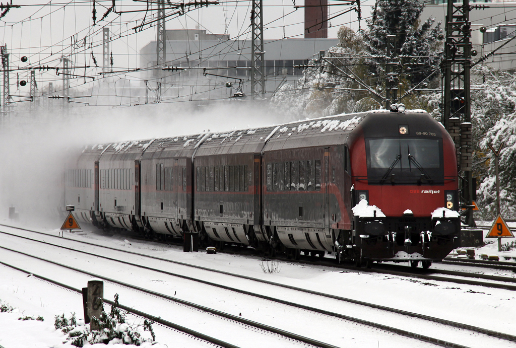 Ein Railjet Taurus schiebt 80-90 703 nach Budapest durch München Heimeranplatz am 28.10.2012