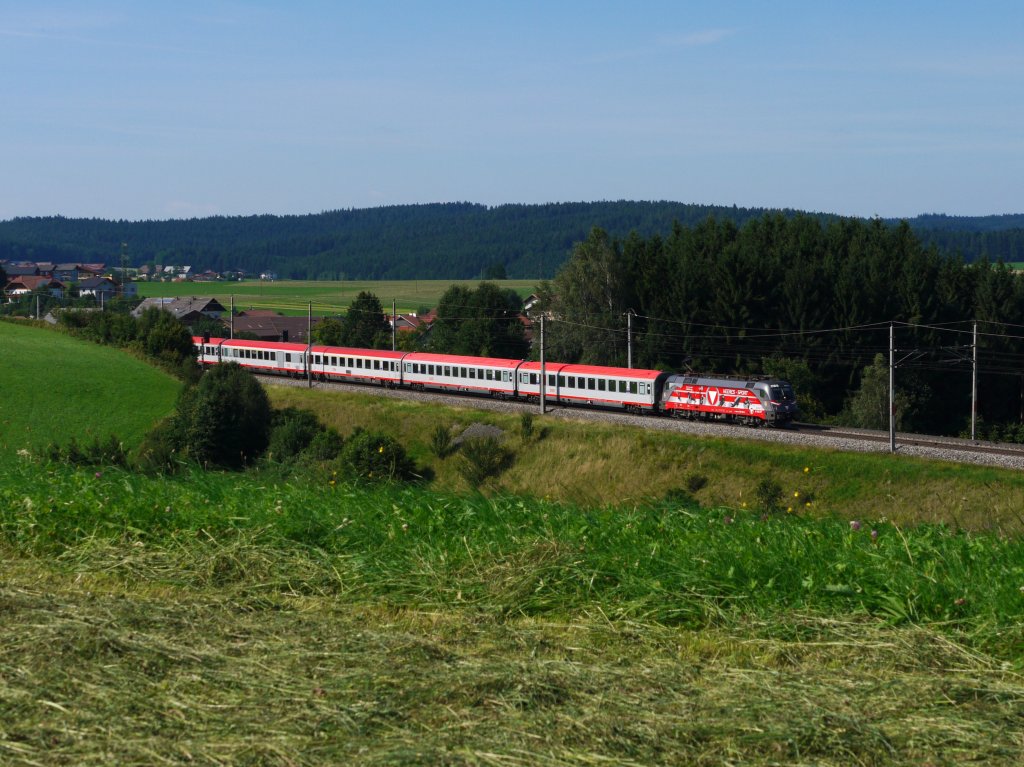 ÖBB 1116 138 "Heeres-Sport" bespannte am 23.07.12 den OIC 691 (Villach Hbf - Wien Westbahnhof) ab Salzburg Hbf, das Foto entstand bei Pöndorf.