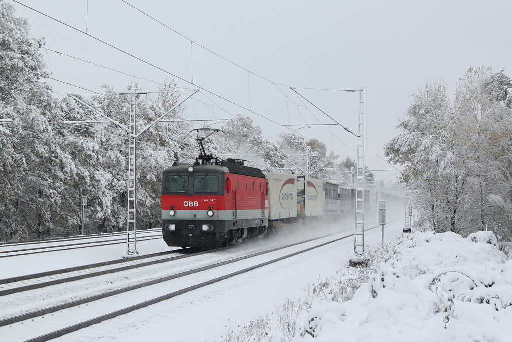 Wintereinbruch im Oktober! 1144 097 ist am 28.10.2012 mit einem KLV Zug in winterlicher Landschaft unterwegs. Aufgenommen zwischen Haar und Vaterstetten (Nähe München).