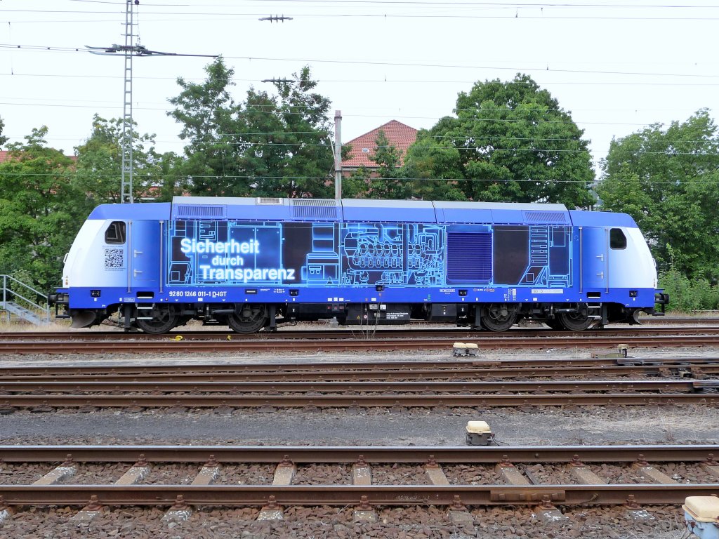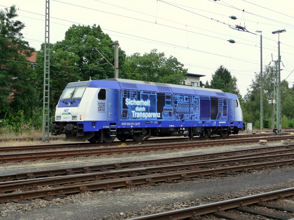 Am 21.08.2012 steht die 9280 1 246 011-1 D-IGT der Inbetriebnahmegesellschaft Transporttechnik mbH (IGT) abgestellt in der Abstellgruppe des Braunschweiger Hbf. Die Lok trägt seit kurzer Zeit eine neue sehr ansprechende Seitenwerbung.