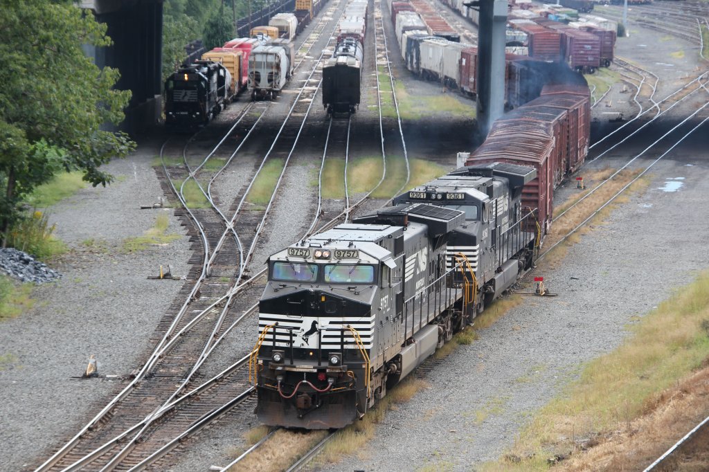 Norfolk Southern 9757 und 9361 (C40-9W) kommt 9.9.2012 mit einem Zug aus Enola Rangierbahnhof.