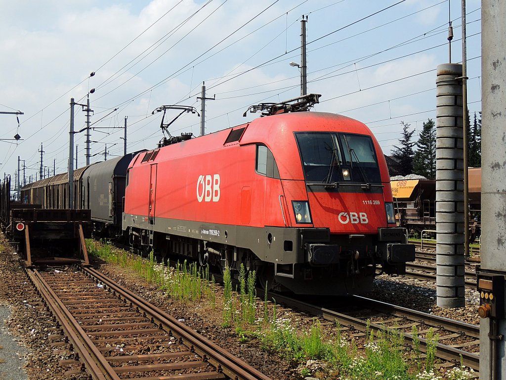 1116 269-2 wird mit einem gemischten Güterzug auf das Bahnsteiggleis in Marchtrenk umgeleitet; 120704