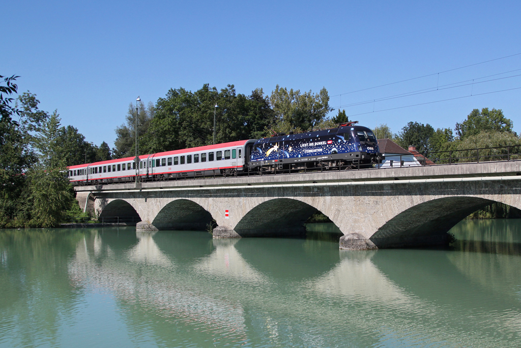1116 126 überquert mit EC 113 am 09.09.2012 die Saalachbrücke zwischen Freilassing und Salzburg.