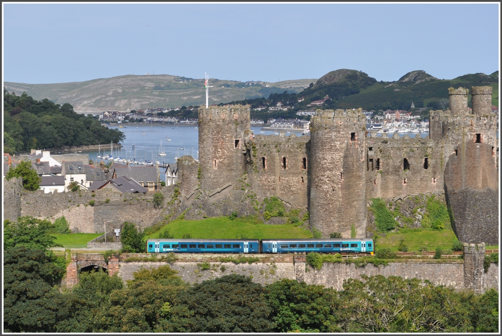 Der 07.21 von Cardiff nach Holyhead passiert das Schloss Conwy. Class 175 von Arriva. (03.09.2012)