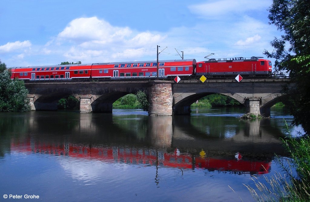 DB BR 143 vor RB 26177 Lutherstadt Eisleben - Halle Saale Hbf., KBS 590 Nordhausen - Halle, fotografiert auf der Saalebrücke bei Angersdorf am 09.07.2011
