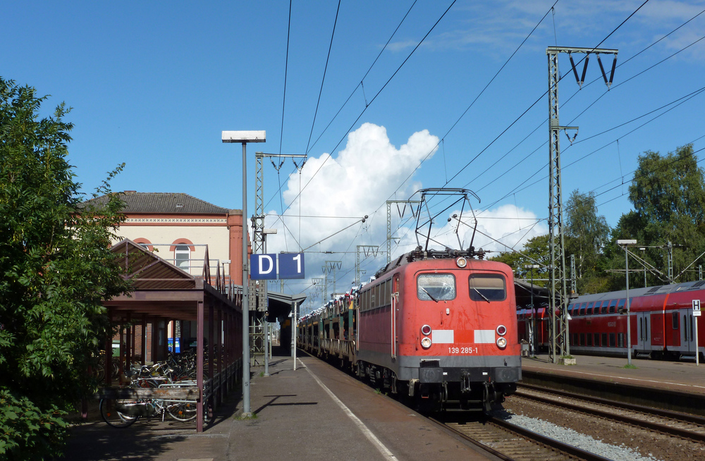 139 285-1 fuhr am 22.09.2012 mit einem Autozug aus richtung Bremen nach Emden, hier in Leer.