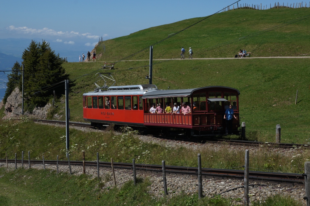 Der historische Triebwagen BDhe 2/4 7 befindet sich am 17.8.12 unterhalb seines Zieles Rigi Kulm.