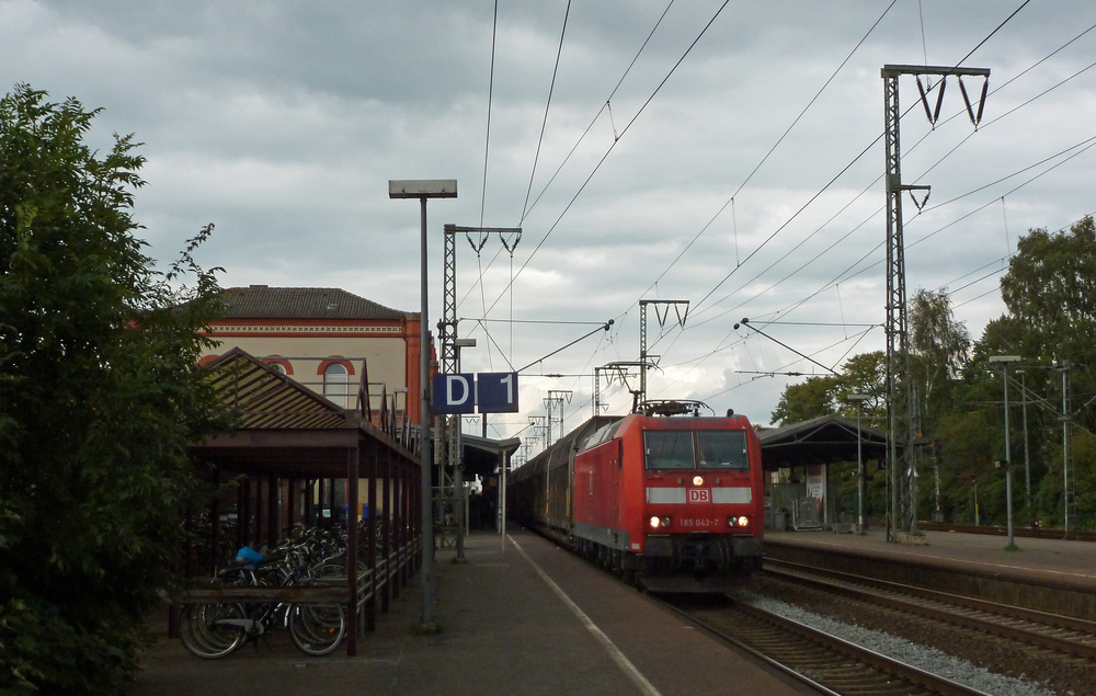 185 043-7 fuhr am 28.09.2012 mit einem Güterzug von Emden nach Osnabrück, hier in Leer.