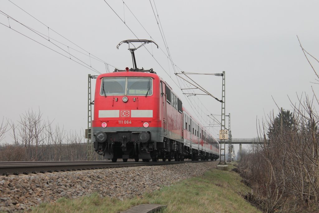 111 064-2 noch mit alter Lackierung am frühen Abend des 04.03.10 mit einer RB nach Basel Bad. Bf bei der Ausfahrt in Müllheim (Baden).