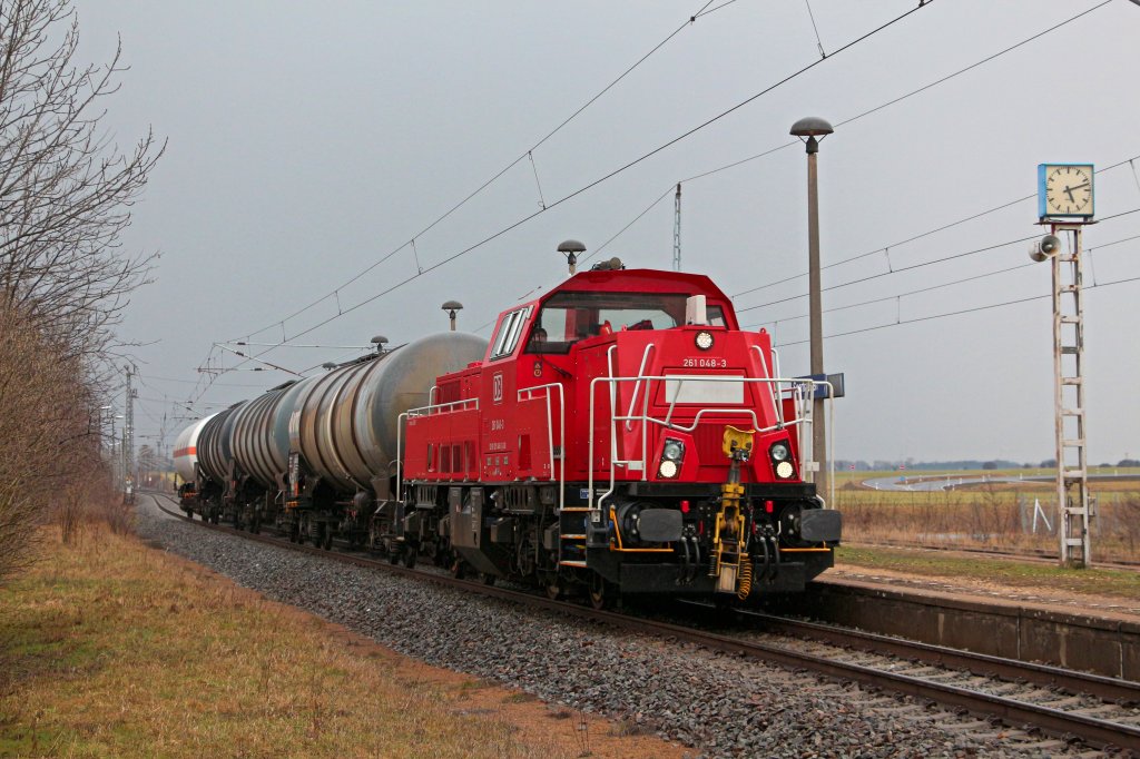 261 048-3 bespannt am 10.04.13 den EK 55045 ( Rhäsa Werkbahnhof-Riesa ) und konnte hier in bei der Durchfahrt in Seerhausen gesichtet werden.