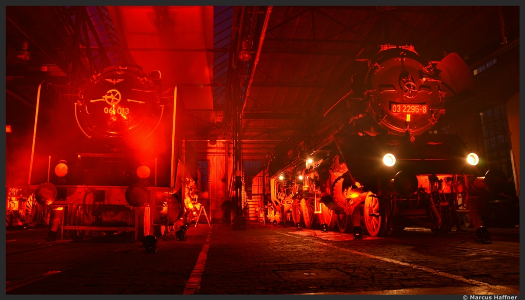 Die 03 2295-8 aus der ehemaligen DDR und die tschechische(?) 06-013 bei "Nacht der Giganten" im Bahnpark Augsburg am 15. März 2013.