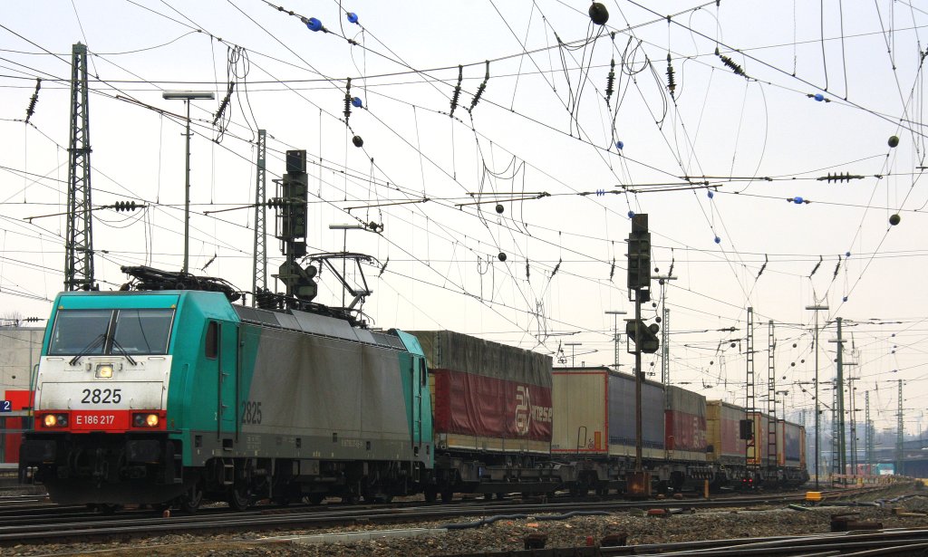 Die Cobra 2825 fährt mit einem Containerzug aus Gallarate(I) nach Zeebrugge(B) bei der Ausfahrt aus Aachen-West und fährt in Richtung Montzen/Belgien bei Sonne und Wolken am 6.4.2013.