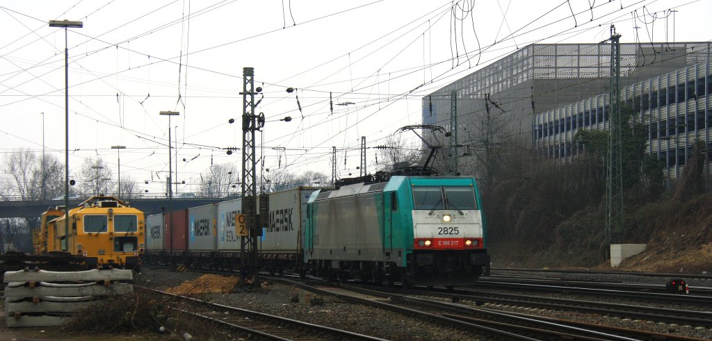 Die Cobra 2825 kommt aus Richtung Montzen/Belgien mit einem Langen Maersk-Containerzug aus Antwerpen(B) nach Leipzig und fährt in Aachen-West ein bei Wolken am 6.4.2013.