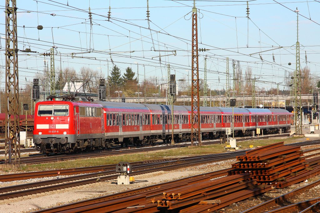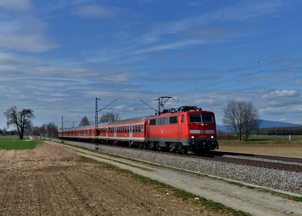 111 019 mit einem RE nach Passau am 14.04.2013 bei Langenisarhofen.