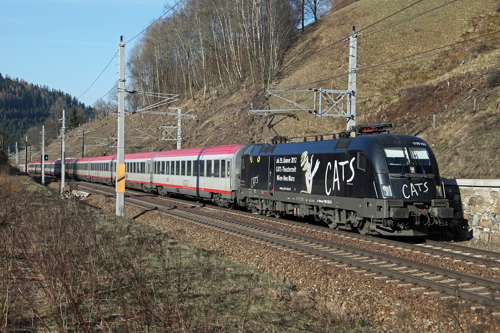 1116 200 ist mit RJ652 am 15.04.2013 beim Steinbauertunnel zwischen Eichberg und Küb zu sehen. Die 1116 200 trägt noch die Railjetversuchslakierung die sich von den Serienloks durch einen geänderten Schriftzug und den roten Balken der auf der schwarzen Front durchgezogen ist unterscheidet.