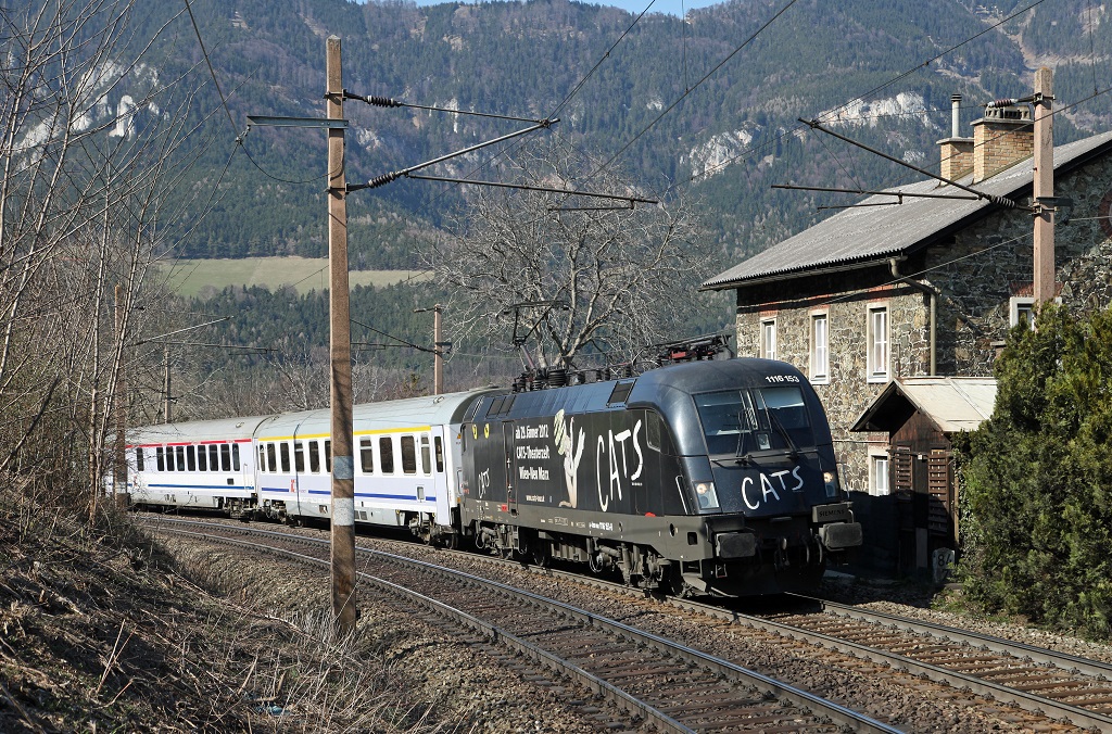 1116 153 (CATS) ist am 15.04.2013 mit EC172 (Villach - Hamburg) bei Spital am Semmering unterwegs.