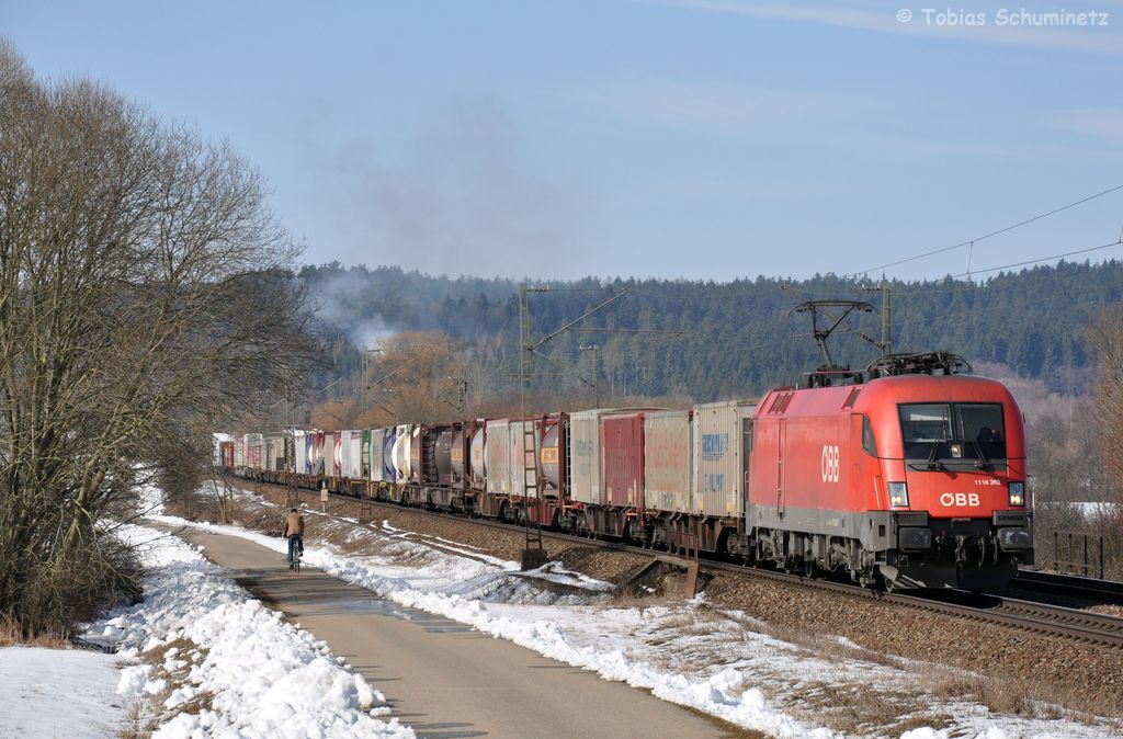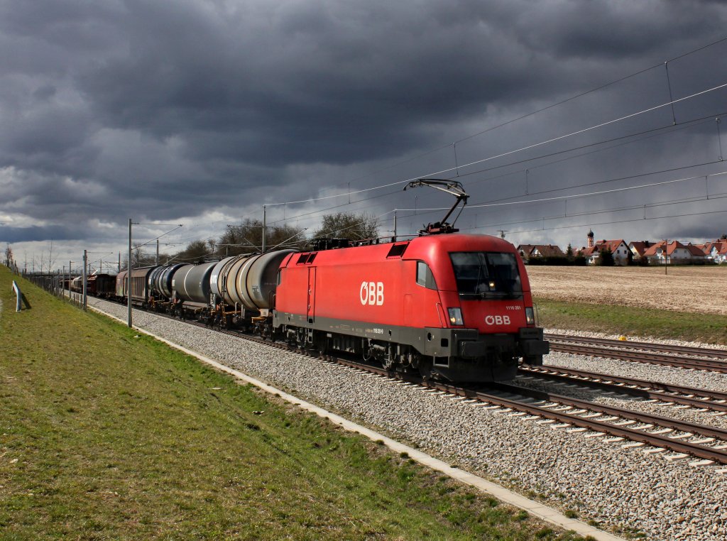 Die 1116 261 mit einem Güterzug am 13.04.2013 unterwegs bei Hattenhofen.